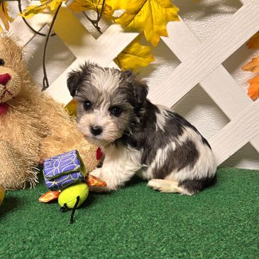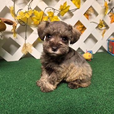 Stunning salt n pepper Parti toy Snorkie girl from Sabrina and Cash. born 9-26-24. she will be about 5 lb around 8-9" tall.